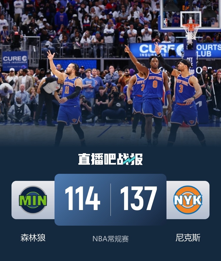 一开场,森林狼率先发力,轮番冲击内线打出15-7的开局,尼克斯内外开花迅速反超,双方陷入拉锯战,森林狼连中三分,尼克斯一波7-0强势回应,森林狼外线开炮飙中4记三分,以58-54领先结束上半场。易边再战,尼克斯火力全开,内外开花一举获得两位数优势,末节尼克斯延续火力,攻防两端压制对手一举将分差拉开到20分以上,森林狼大势已去回天无力。最终,尼克斯137-114击败森林狼,主场过关。