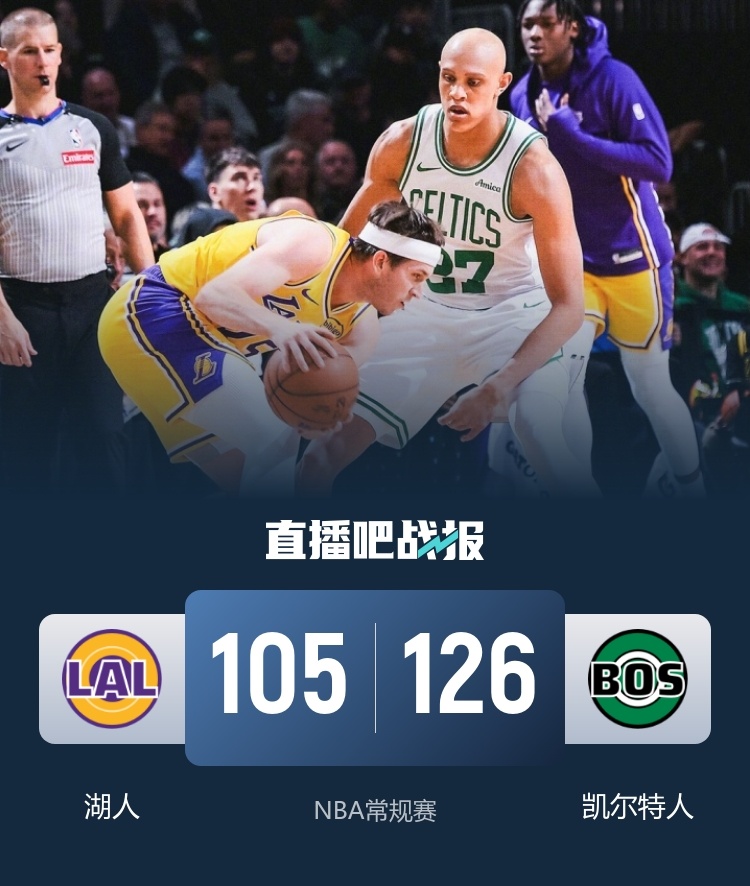 比赛开始,里夫斯遭遇严防死守,湖人完全打不开进攻局面,凯尔特人连续外线发炮轰出11-3开局,随后凯尔特人外线多点开花,单节扔进7记三分直接建立20分以上领先,次节绿军外线继续发炮扩大至近30分领先,文森特里突外投止血,但绿军半场还是领先23分。下半场,里夫斯状态回暖,里突外投单节轰下16分带队追分,但凯尔特人外线依然能回应,三节绿军还领先15分,末节绿军又3记三分拉开比分,里夫斯连续回应苦苦支撑,但分差还是保持在20分左右,最终凯尔特人126-105轻取湖人,拿到4连胜。